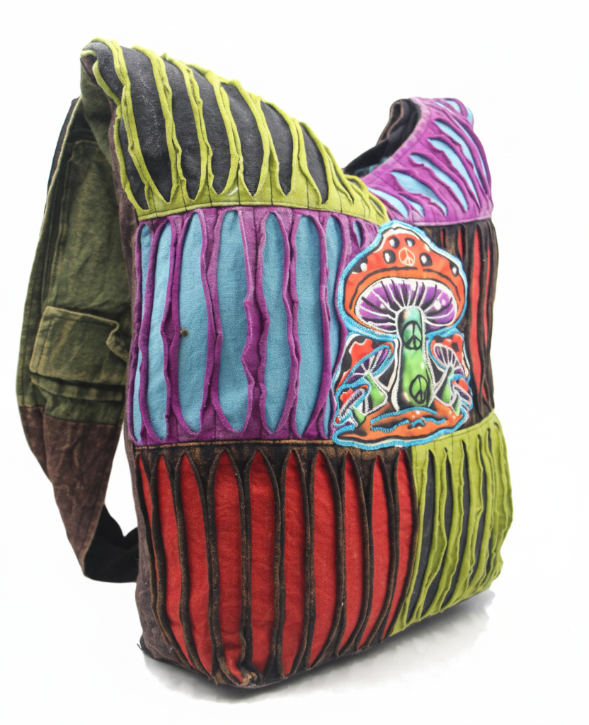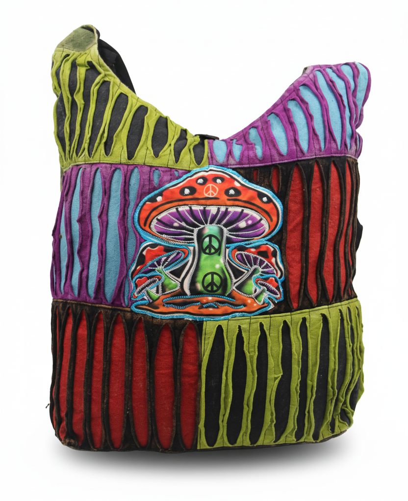 The Handmade Hippie Mushroom Shoulder Bag is a vintage-inspired boho tote, handcrafted by skilled artisans in Nepal. Featuring intricate mushroom embroidery and authentic razor-cut patchwork, this bag combines classic hippie charm with functional festival-ready design. Lightweight, durable, and comfortable to carry, it is perfect for festivals, travel, street wear, and everyday bohemian style. Each bag is individually handmade, ensuring unique patterns and one-of-a-kind charm.