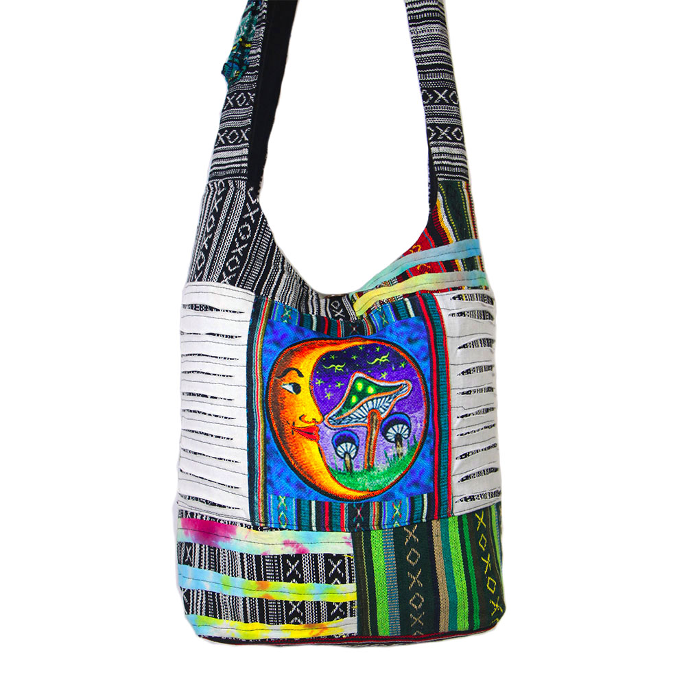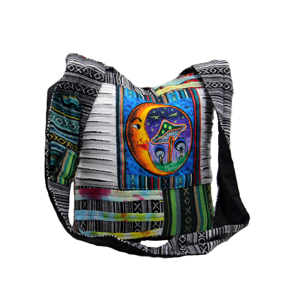 he Handmade Mushroom Embroidery Jogi Bag is an authentic razor cut patchwork hippie sling bag crafted by skilled artisans in Nepal. Featuring detailed mushroom embroidery and traditional patchwork fabric, this bag reflects classic Himalayan jogi and bohemian festival style. Lightweight, durable, and comfortable to carry, it is ideal for festivals, travel, street wear, and everyday boho fashion. Each bag is individually handmade, making every piece unique in color and pattern.