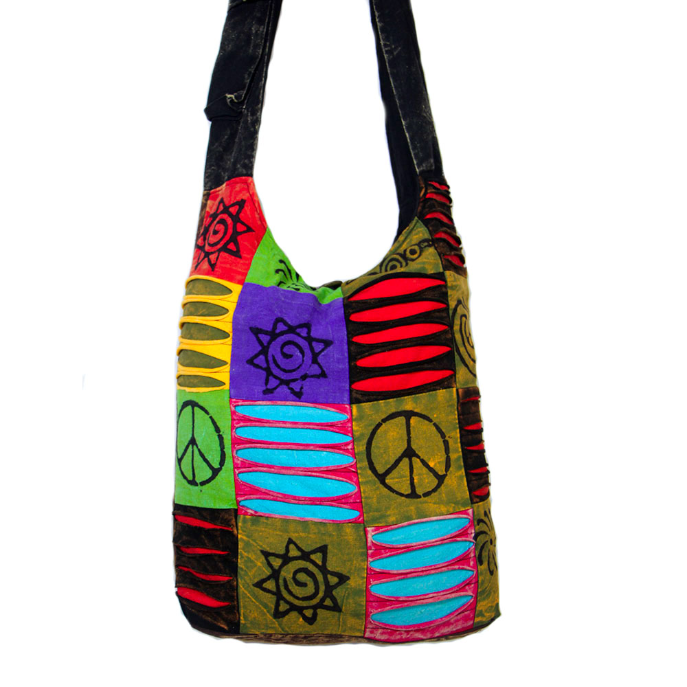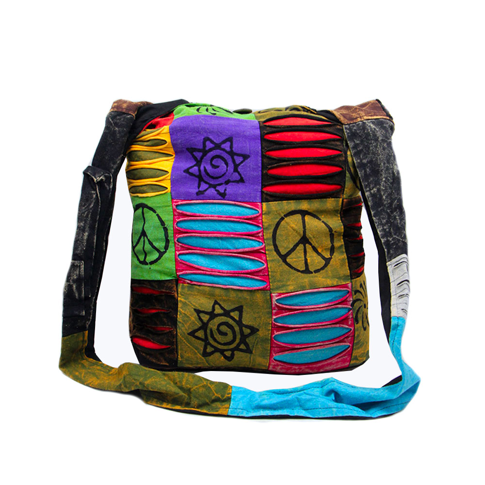 The Wholesale Hippie Shoulder Bag features a bold peace sign patchwork design with traditional razor cut detailing, handmade by skilled artisans in Nepal. Inspired by classic hippie and festival culture, this boho shoulder bag combines vibrant patchwork fabric with a relaxed, comfortable sling style. Lightweight yet durable, it is ideal for festivals, travel, street wear, and everyday alternative fashion.
